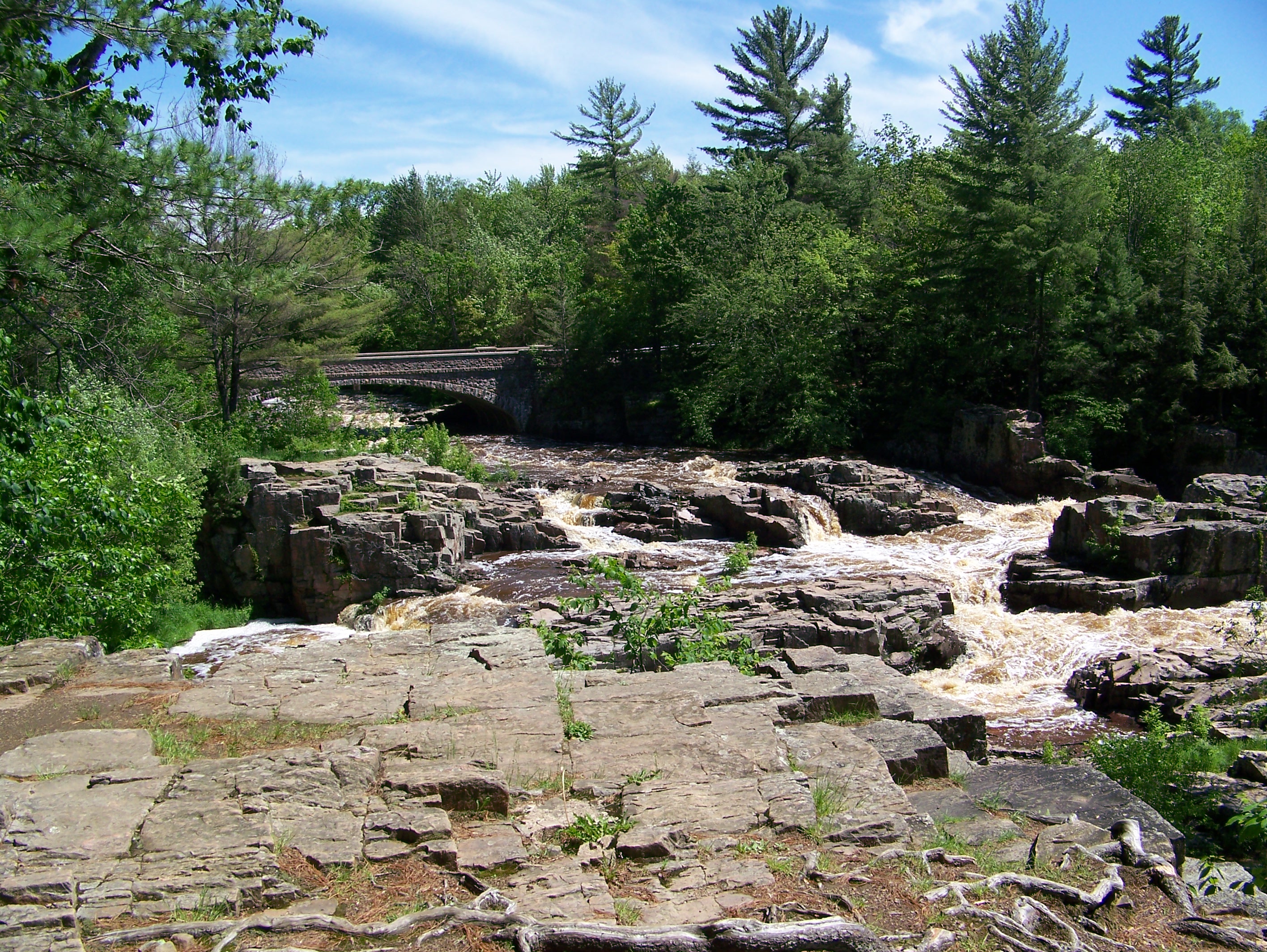 The old County Y stone bridge just above the Dells of the Eau Claire, taken from a rock outrcropping over the river a day or two after heavy rains in 2008 (personal photo, as are others in this post; click for larger view)