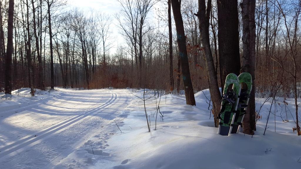 Those used to having only two or three cars with “Coexist” bumper stickers in the Plover River lot might wonder whether peace and quiet are possible at Nine Mile. We were mildly disconcerted, but headed to its chalet to purchase our $6 day passes ($5 seniors) for snowshoeing the forest.