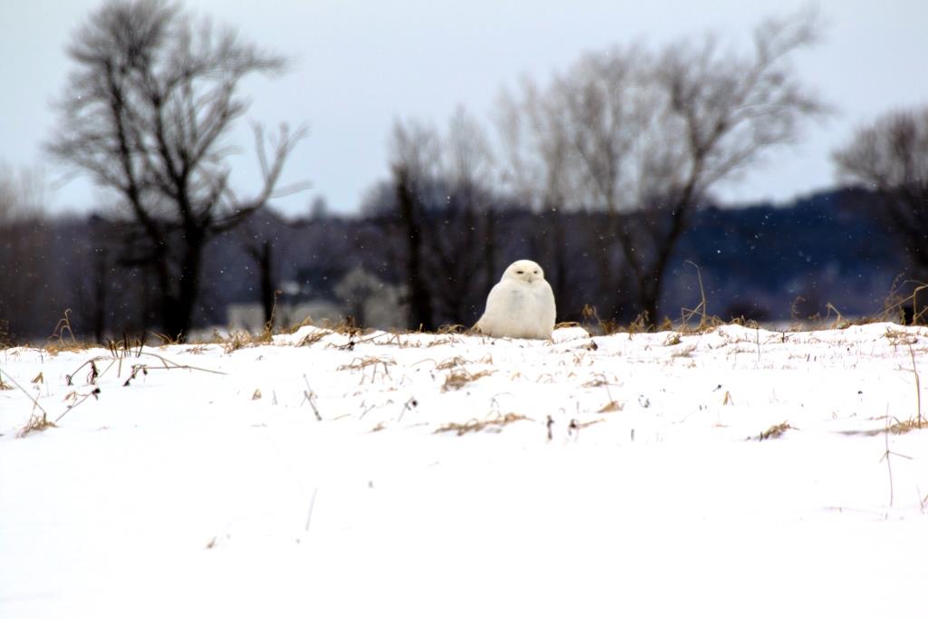 Christina spotted one owl from about a football field’s distance, sitting up on top of a snowy hillock in a pasture and looking for all the world like the first stage of a snowman’s abdomen – just a lump of white in a field of white.